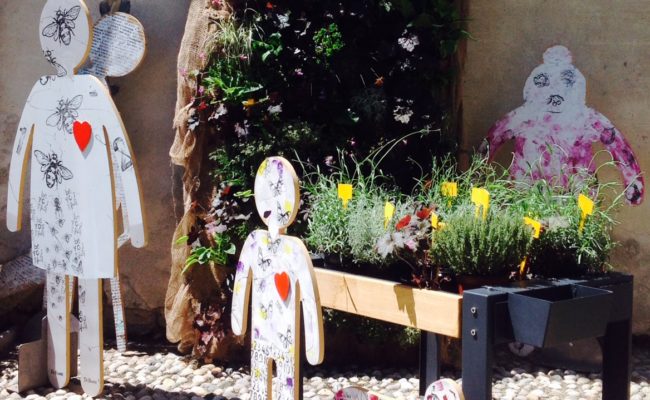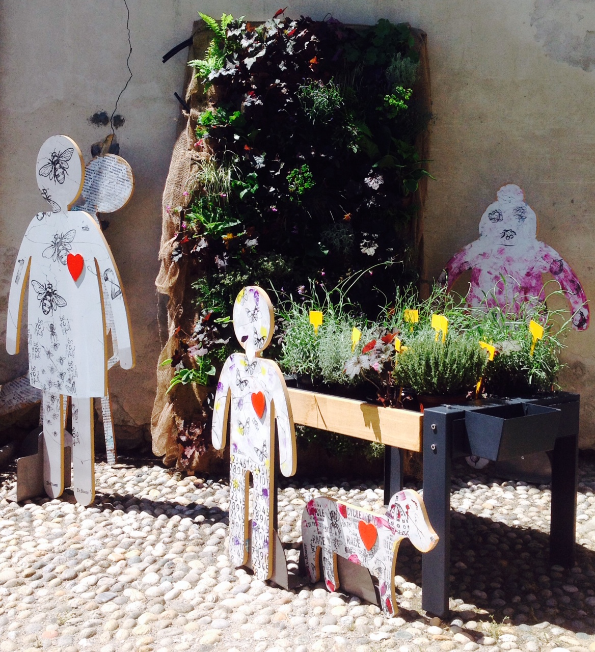 Allestimento di spazio adibito ad ortoterapia, con tavoli di orticoltura e silouette di persone disabili, con la finalità di sensibilizzare all’argomento, all’interno della manifestazione di Orticino, del cortile di Villa Picchetta.